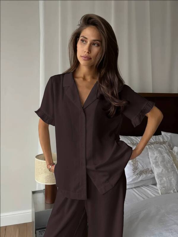 • Низ: штани прямого крою з елегантними оборками внизу.