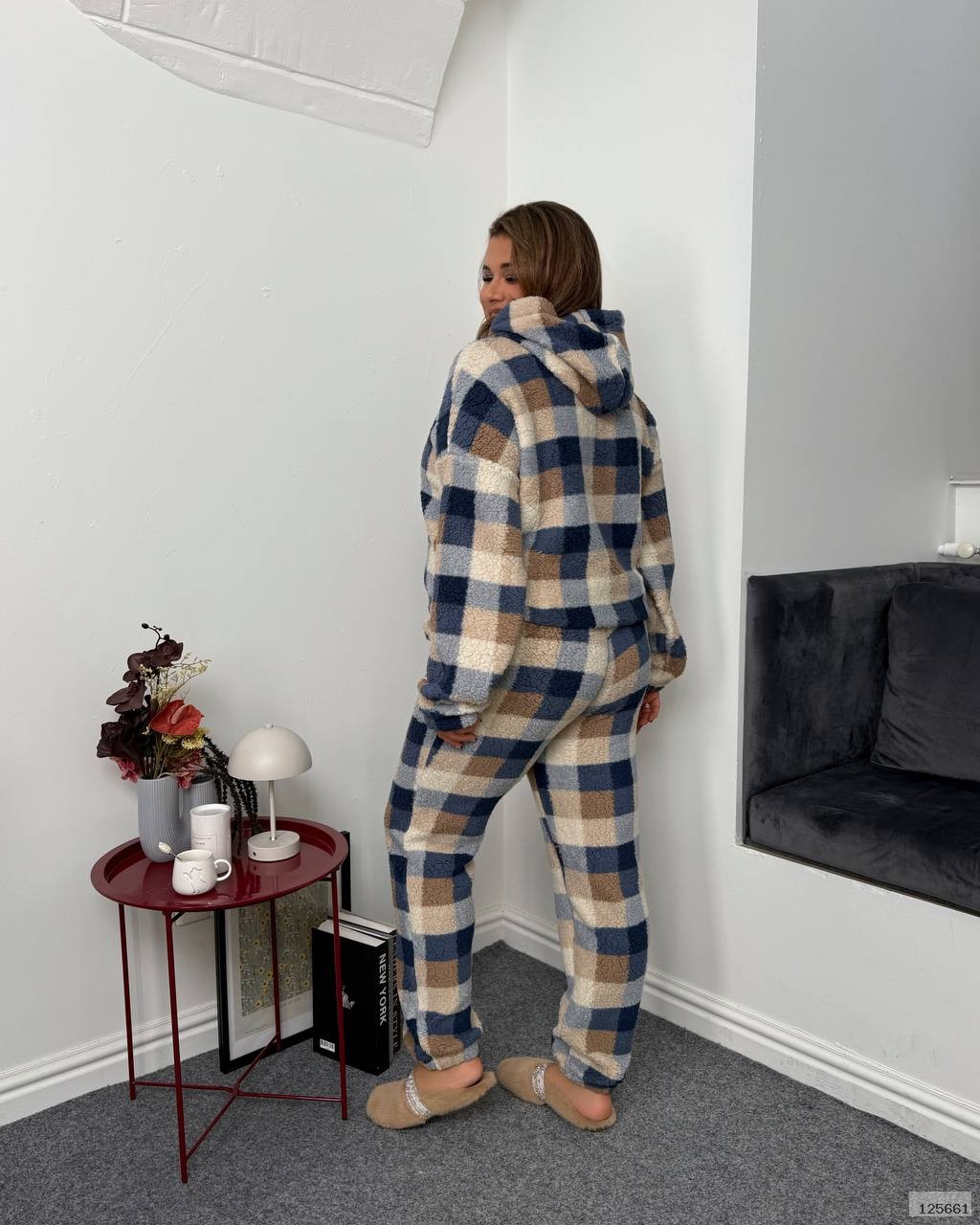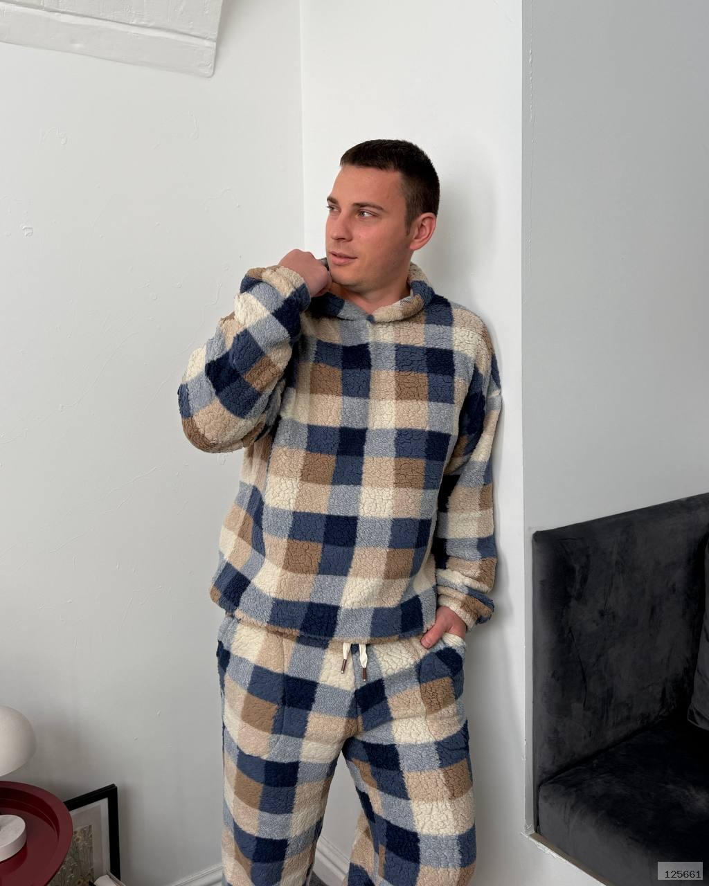 Затишна піжама,що складається з худі з капюшоном та штанів з еластичним поясом і шнурком.