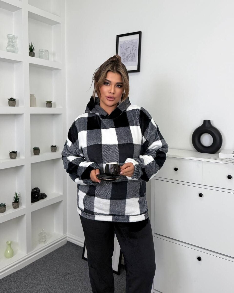 Затишна піжама,що складається з м’якої кофти-кенгуру з капюшоном та штанів на еластичній резинці зі шнурком і кишенями.