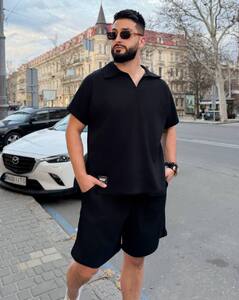 Стильний комфортний костюм з шортами з трикотажу еластан : футболка поло у стилі оверсайз з акс + шорти з високою посадкою з кішенями у бічних швах, з куліскою на поясі