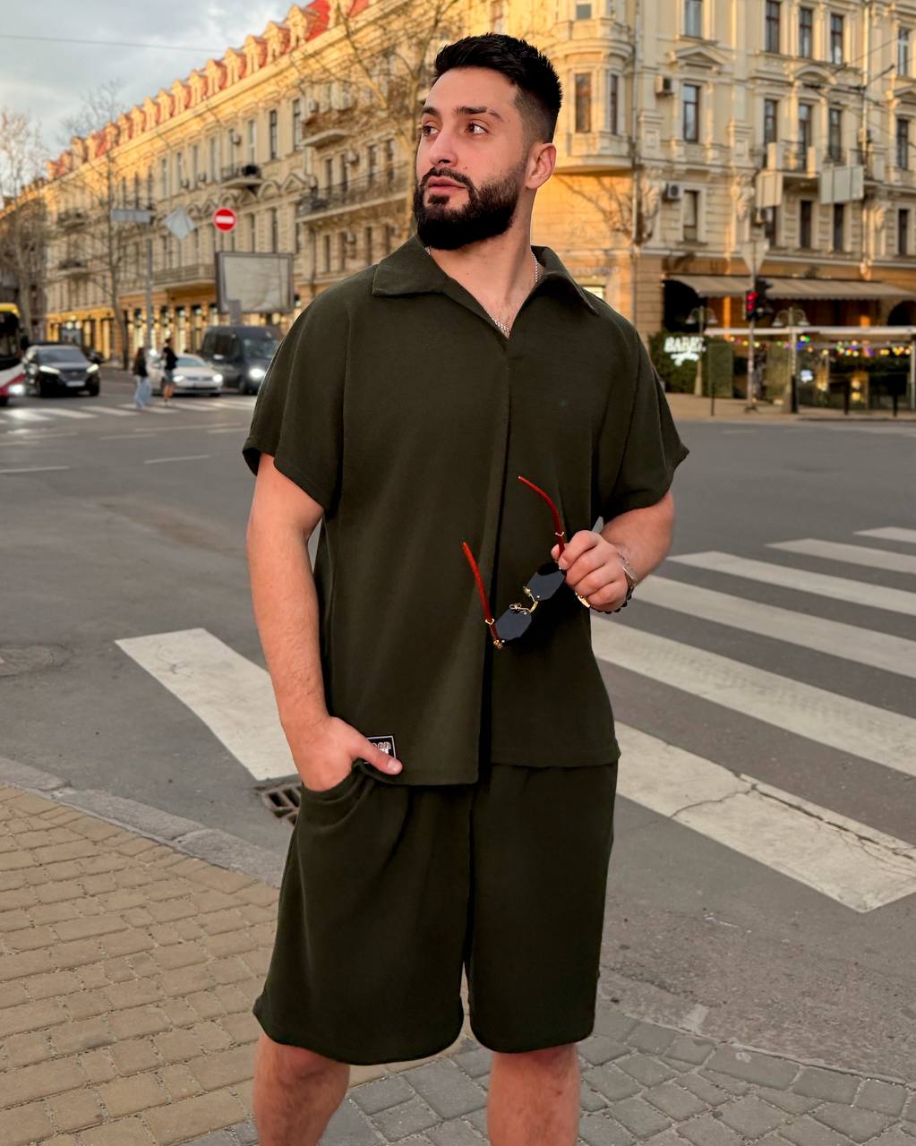 Стильний комфортний костюм з шортами з трикотажу еластан : футболка поло у стилі оверсайз з акс + шорти з високою посадкою з кішенями у бічних швах, з куліскою на поясі