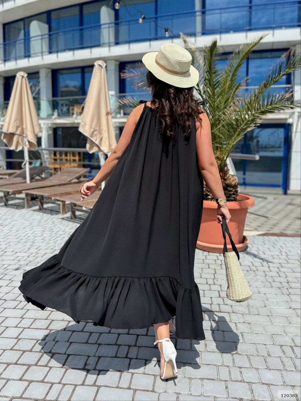 Літній сарафан. Довгий нижче коліна, вільного крою, на плечах зав'язки, внизу сарафана рюш.
