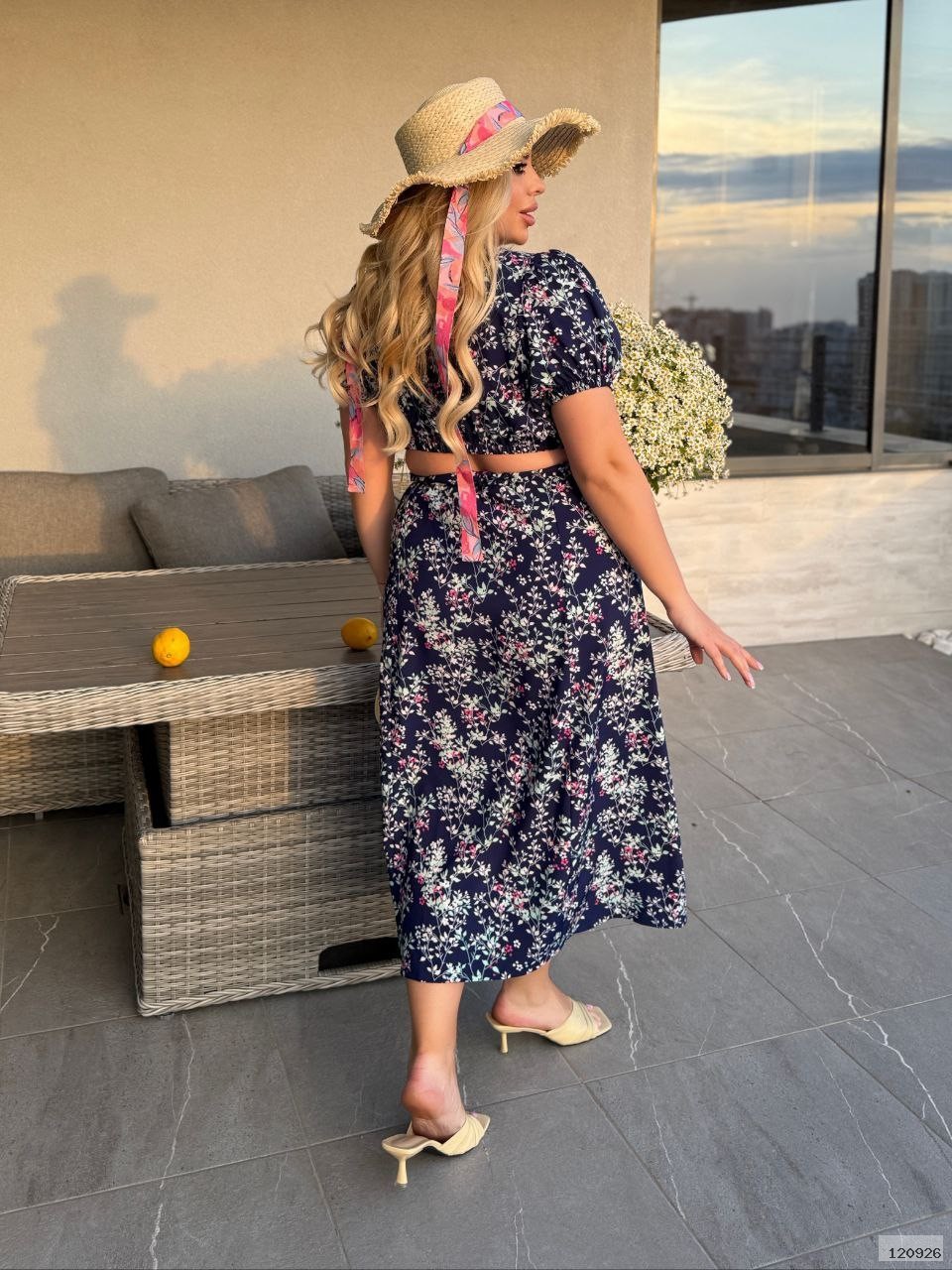 Літній костюм, Спідниця. Кофта з коротким рукавом - ліхтариком, низ кофти прилаштований на резинці, горловина прилаштована шнурком. Спідниця по фігурі з розрізом одну ногу, на поясі гумка.
