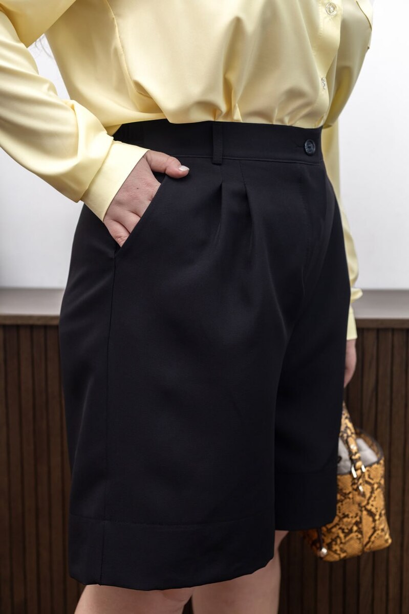 Шорти-бермуди, в яких зручно протягом усього дня та легко виглядати стильно. Вільний прямий крій і довжина до коліна формують сучасний, збалансований силует. Висока посадка підкреслює талію, а пояс на м’якій резинці забезпечує комфортну фіксацію без зайвого тиску. Є кишені — для зручності в щоденному ритмі. Модель легко комбінується з базовим верхом і вписується як у розслаблені, так і більш зібрані образи.