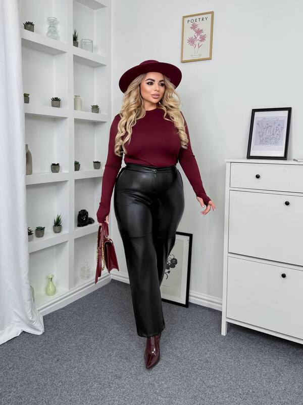 Брюки прямого крою з якісної еко-шкіри люкс. Тканина не тріскається, не розтягується та не втрачає колір. Завищена талія, резинка по спинці, блискавка, трикотаж на велюрі, дуже приємні та мʼякі з середини