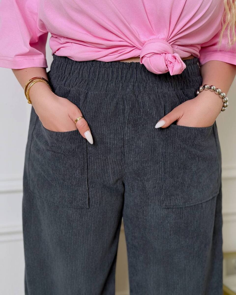 Жіночі брюки вільного крою з м’якого вельвету в розслабленому casual-стилі. Модель із високою посадкою та зручною еластичною резинкою на талії, що забезпечує комфорт і гарно підкреслює силует. Широкі прямі штанини красиво струмують та візуально подовжують ноги. Спереду — великі накладні кишені, які додають практичності та стильного акценту .