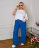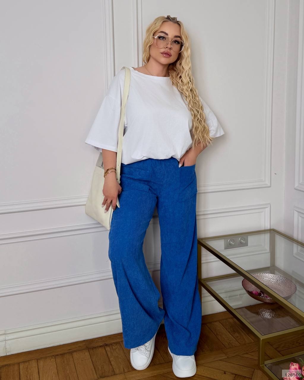 Жіночі брюки вільного крою з м’якого вельвету в розслабленому casual-стилі. Модель із високою посадкою та зручною еластичною резинкою на талії, що забезпечує комфорт і гарно підкреслює силует. Широкі прямі штанини красиво струмують та візуально подовжують ноги. Спереду — великі накладні кишені, які додають практичності та стильного акценту .