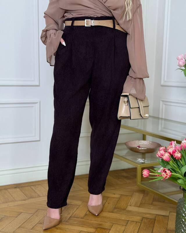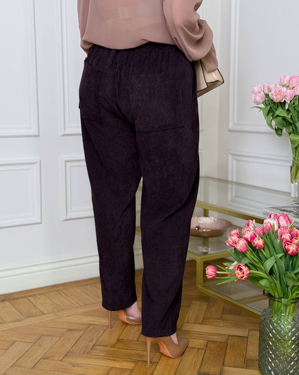 Брюки злегка завужені донизу, вільного крою. Виконані з вельвету в широкий рубчик. Посадка середня, спереду є м’які складки, що додають об’єму в зоні стегон. Ззаду — накладні кишені. Тканина виглядає щільною, але м’якою, що забезпечує комфорт та тримає форму. Стиль — casual, з легким ретро-акцентом