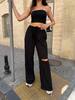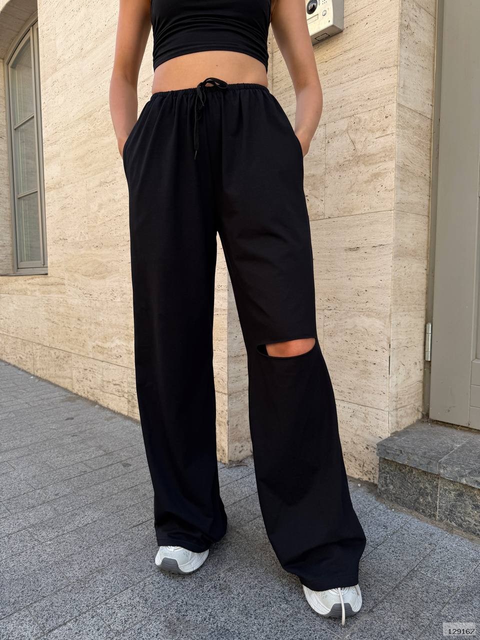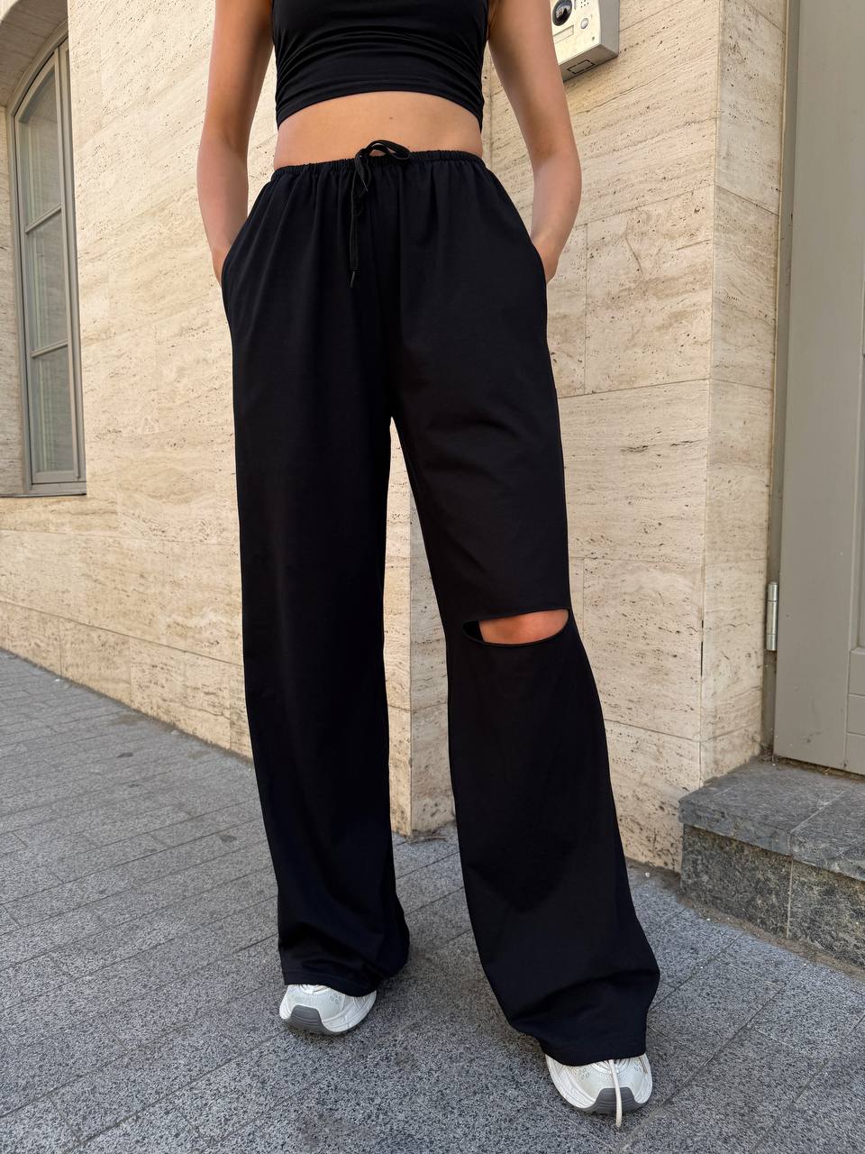 Штани прямого силуету на резинці, з ефектним розрізом на коліні — трендовий акцент, що додає зухвалості та стилю. Легка натуральна тканина дарує комфорт у спекотні дні