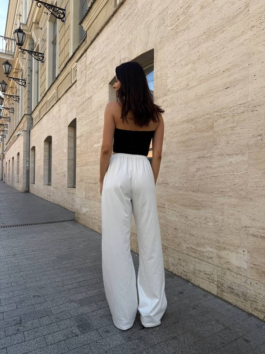 Штани прямого силуету на резинці, з ефектним розрізом на коліні — трендовий акцент, що додає зухвалості та стилю. Легка натуральна тканина дарує комфорт у спекотні дні