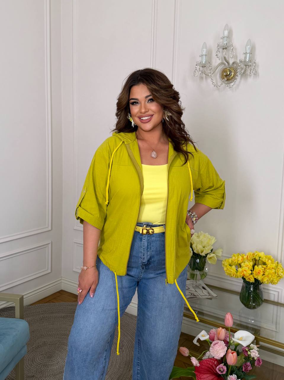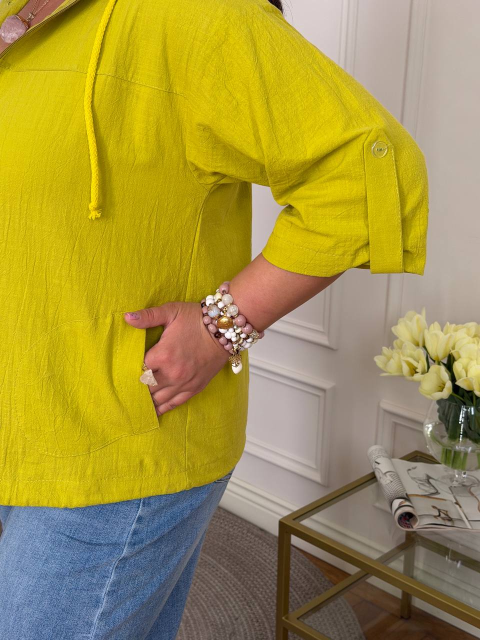 Блуза із дуже класної мʼякої натуральної тканини на блискавці, із капюшоном та кишенями. Рукав застібається на ґудзик. В капюшоні та по низу блузи є канати.
