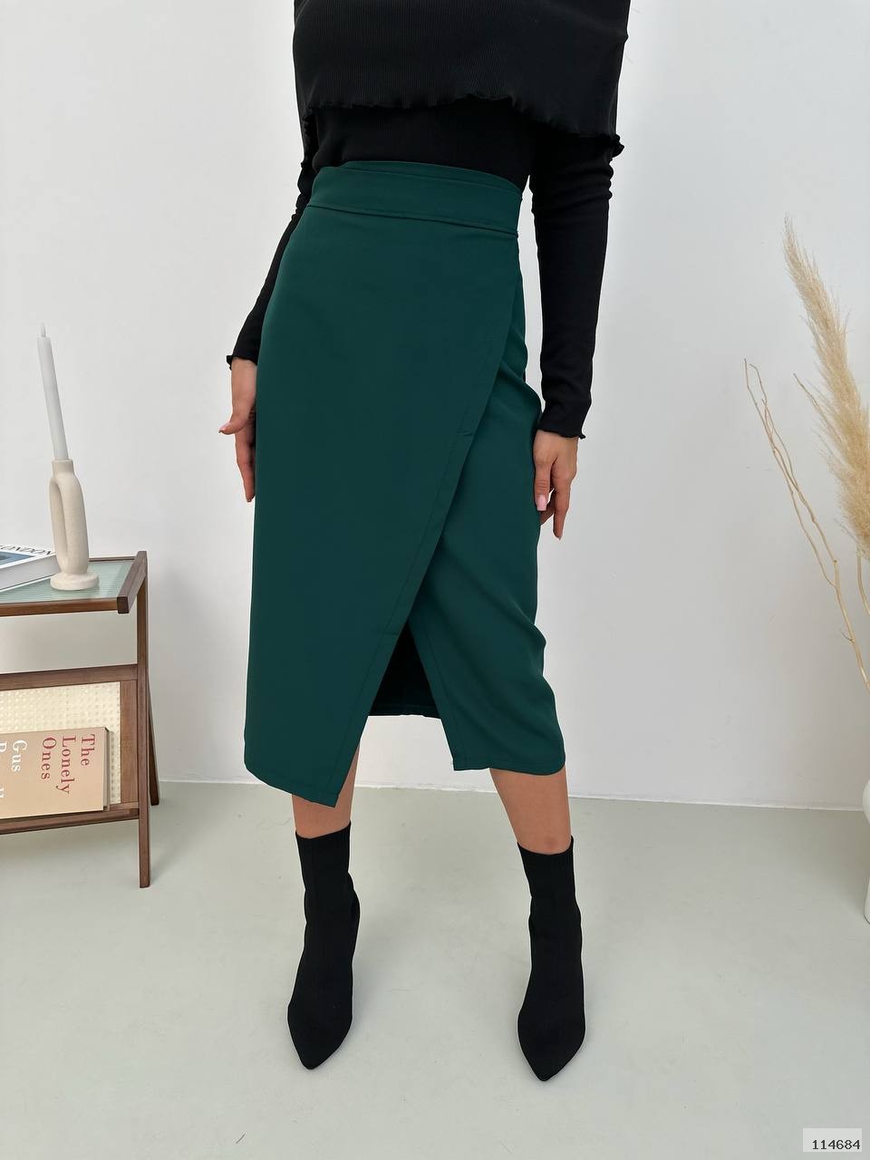 Подовжена юбка з імітацією запаха. Робить силует стрункішим, а спокусливий виріз придасть елегантності образу