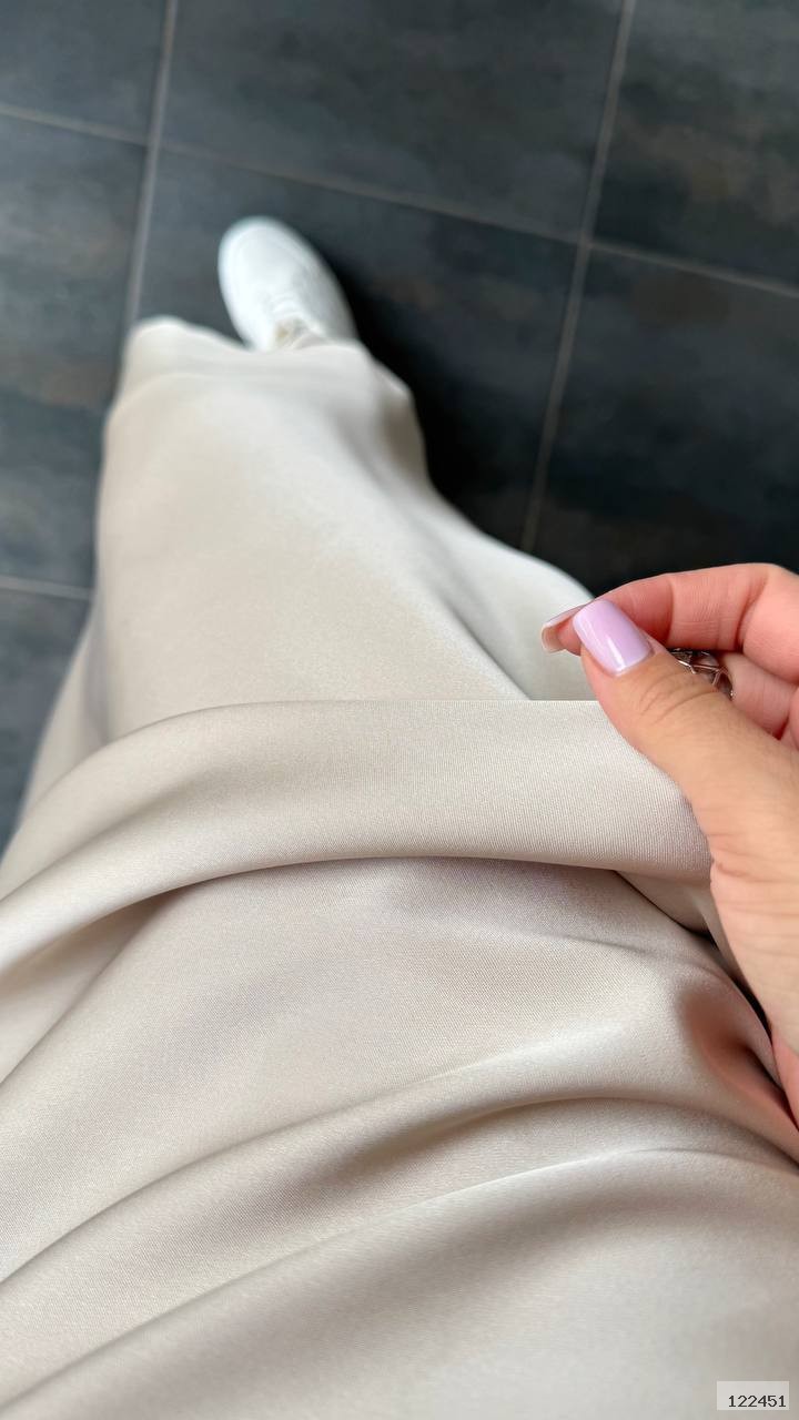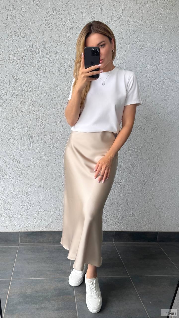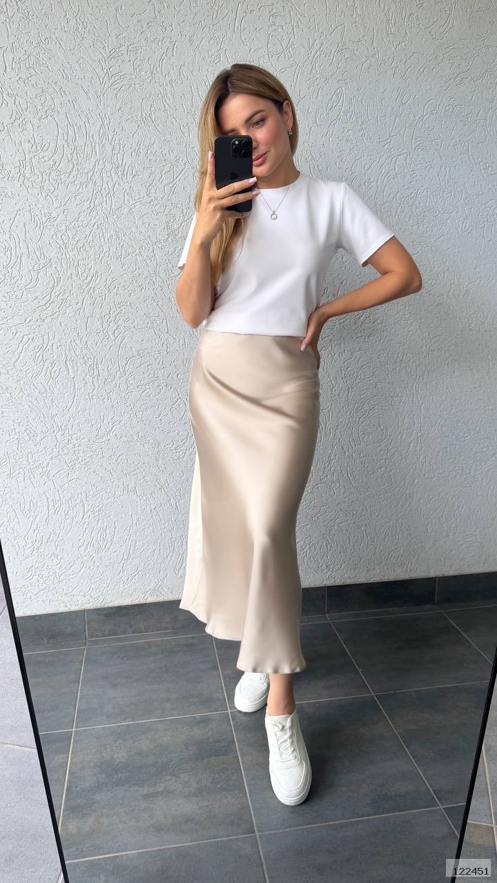Спідниця міді, талія на резинці, тканина трохи тягнеться. Тканина приємна до тіла, дуже гарно спадає