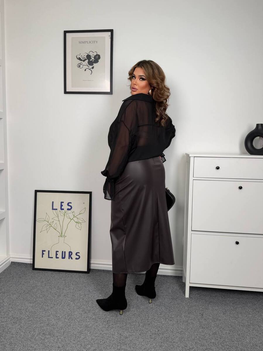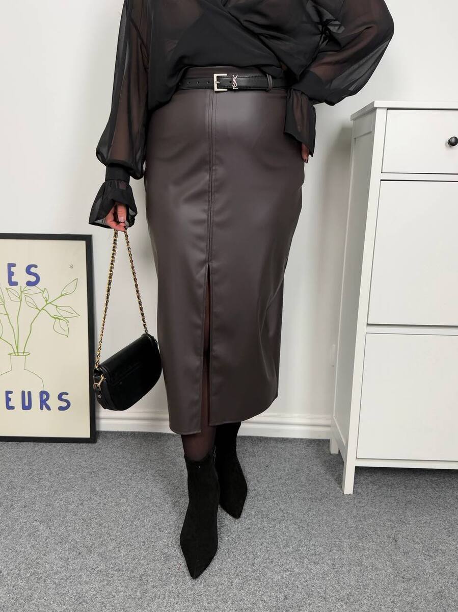Ефектна спідниця з еко-шкіри — це ідеальний варіант для створення жіночного, впевненого та сучасного образу. Модель має високу посадку, чудово підкреслює талію та стегна, а елегантний розріз спереду додає вишуканості й робить посадку ще більш привабливою. Тканина щільна, еластична, добре тримає форму й комфортно сидить протягом дня.