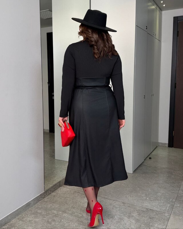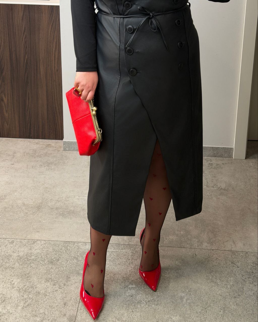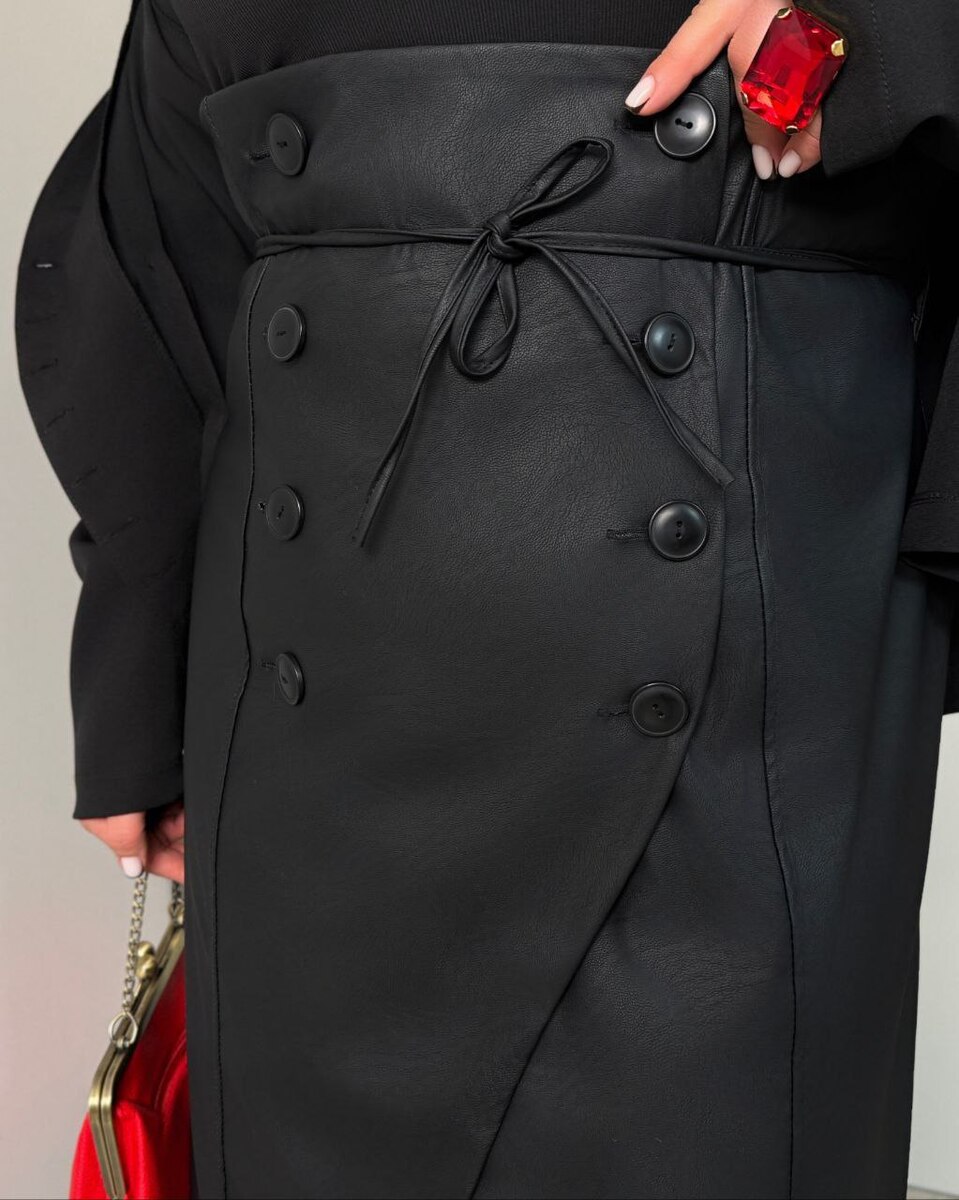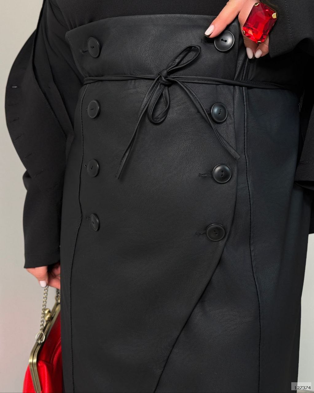 Шкіряна спідниця на запах, із завищеною талією, застібка функціональні ґудзики, також є шлевки під пояс, поясок у комплекті.