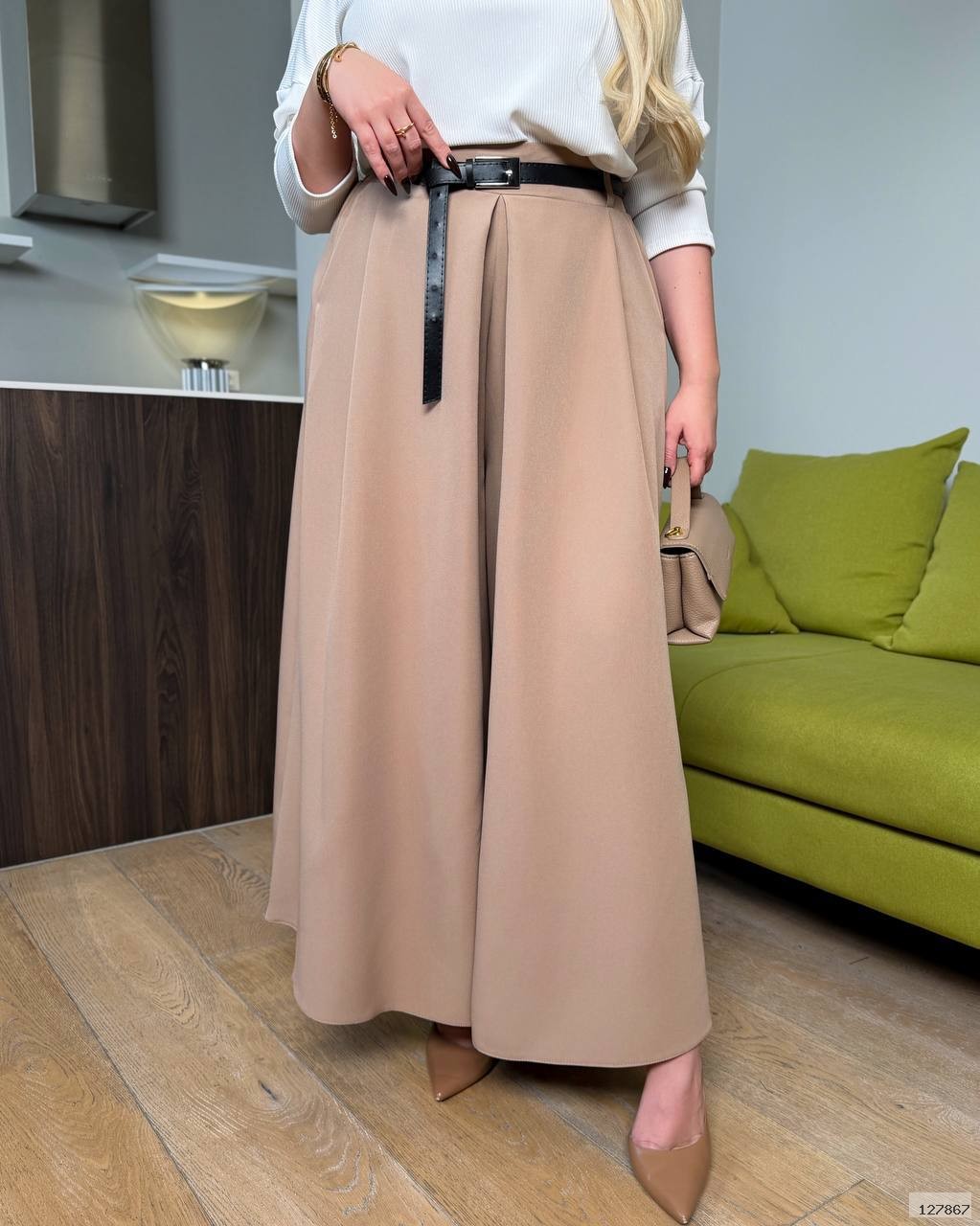 СПІДНИЦЯ-БРЮКИ - модний тренд сезону додає жіночності та елегантності образу. Вільний крій складки по переду ,висока талія , пояс частково на гумці. Шльовки , пояс з еко шкіри в комплекті Косі кишені в бічних швах.