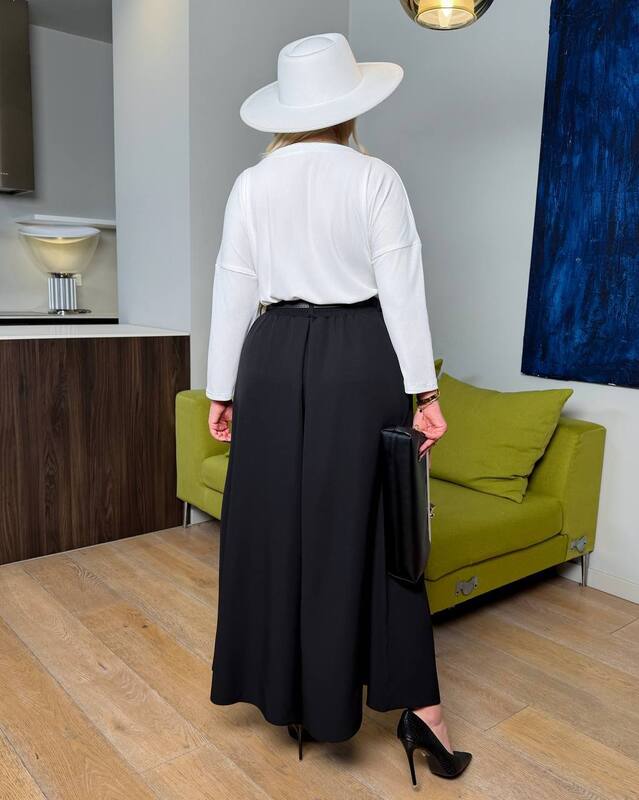 СПІДНИЦЯ-БРЮКИ - модний тренд сезону додає жіночності та елегантності образу. Вільний крій складки по переду ,висока талія , пояс частково на гумці. Шльовки , пояс з еко шкіри в комплекті Косі кишені в бічних швах.