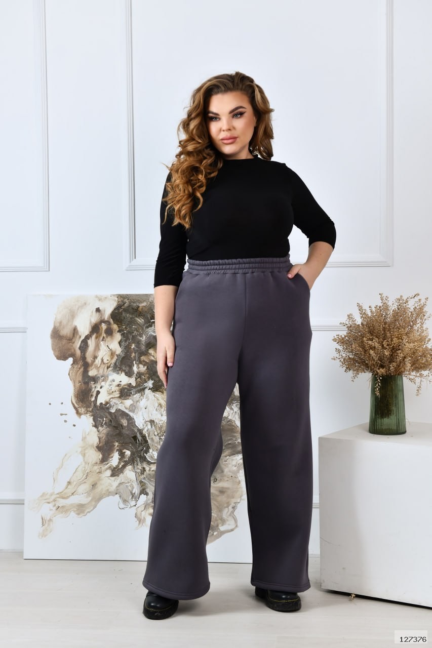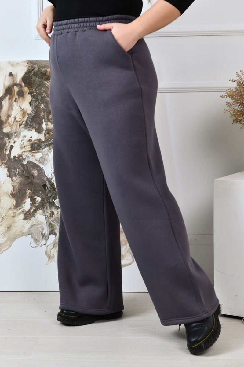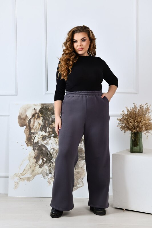 Стильні прямі широкі брюки-палаццо виготовлені з якісного трикотажу тринитка з начосом, що забезпечує середню розтяжність матеріалу та комфорт під час носіння. Ці брюки мають посадку, яка розташована трохи вище середньої, завдяки чому вони стильно підкреслюють талію, а еластична резинка по талії додає зручності і дозволяє прекрасно підлаштуватися під фігуру. В бокових швах розташовані практичні кишені, які не тільки доповнюють дизайн виробу, але й додають функціональності й зручності в повсякденному використанні.