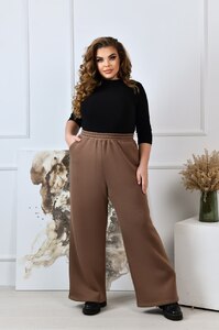 Стильні прямі широкі брюки-палаццо виготовлені з якісного трикотажу тринитка з начосом, що забезпечує середню розтяжність матеріалу та комфорт під час носіння. Ці брюки мають посадку, яка розташована трохи вище середньої, завдяки чому вони стильно підкреслюють талію, а еластична резинка по талії додає зручності і дозволяє прекрасно підлаштуватися під фігуру. В бокових швах розташовані практичні кишені, які не тільки доповнюють дизайн виробу, але й додають функціональності й зручності в повсякденному використанні.