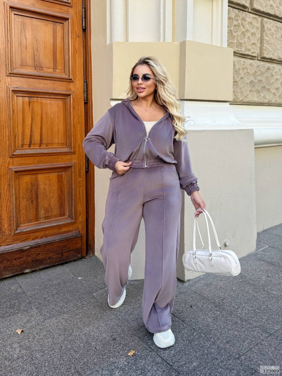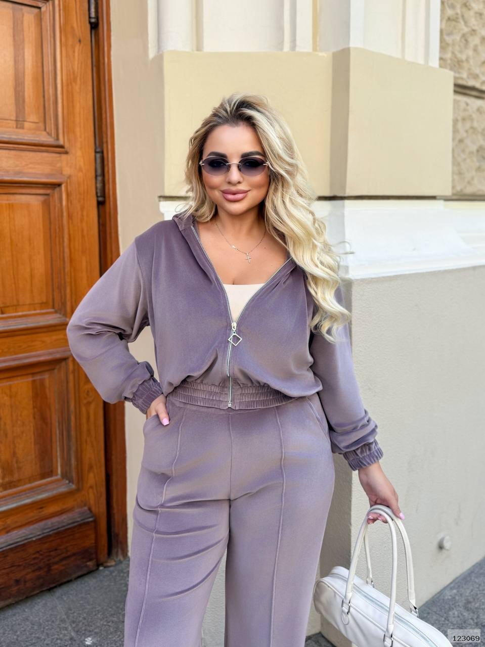 Прогулянковий трендовий костюм з велюру складається з вкороченої кофти та зручних штанів. М’який матеріал дарує комфорт і стиль одночасно. Ідеальний вибір для повсякденних образів, які хочеться зробити модними та затишними.
