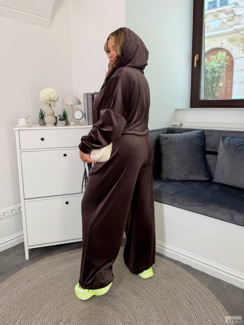 Фасон вільний, не сковує рухів, акцент на комфорт і стиль. Кофта має спущене плече, рукав повної довжини, низ на манжеті. Штани — з високою талією на резинці, злегка розширені донизу, виглядають легко й жіночно.