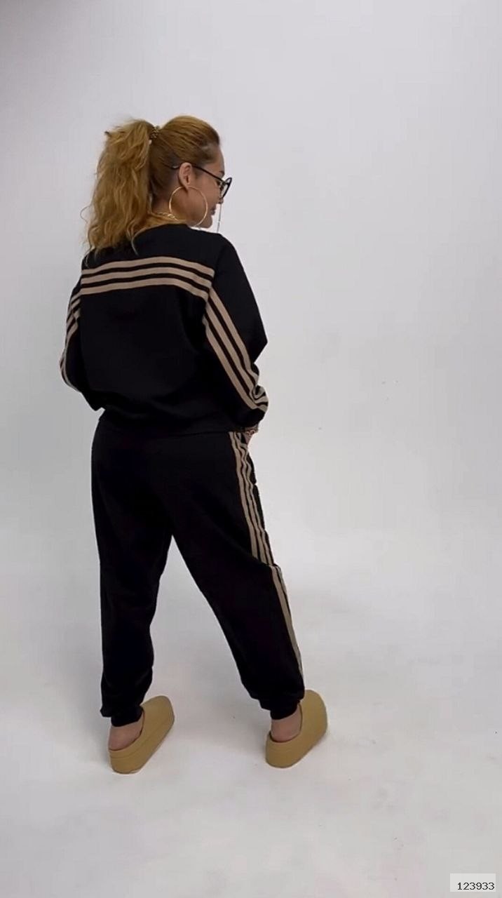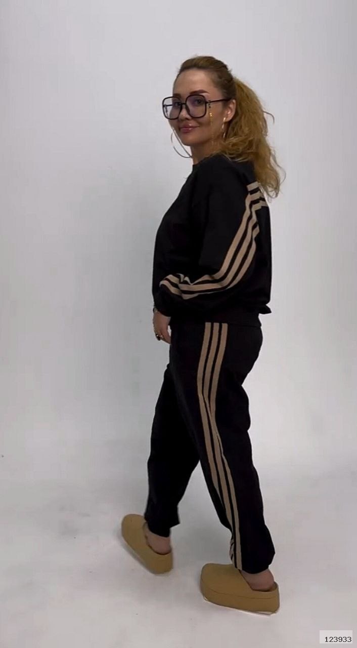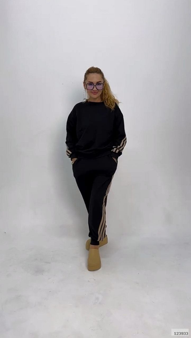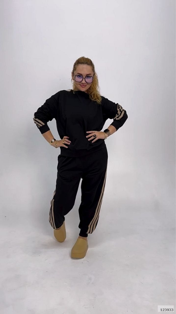 Стильний прогулянковий костюм, штани на високій посадці, кругова резинка, манжети. Кофтинка вільного крою, декорована стильними лампасами. Костюм виготовлений с двунитки, гарна розтяжність.