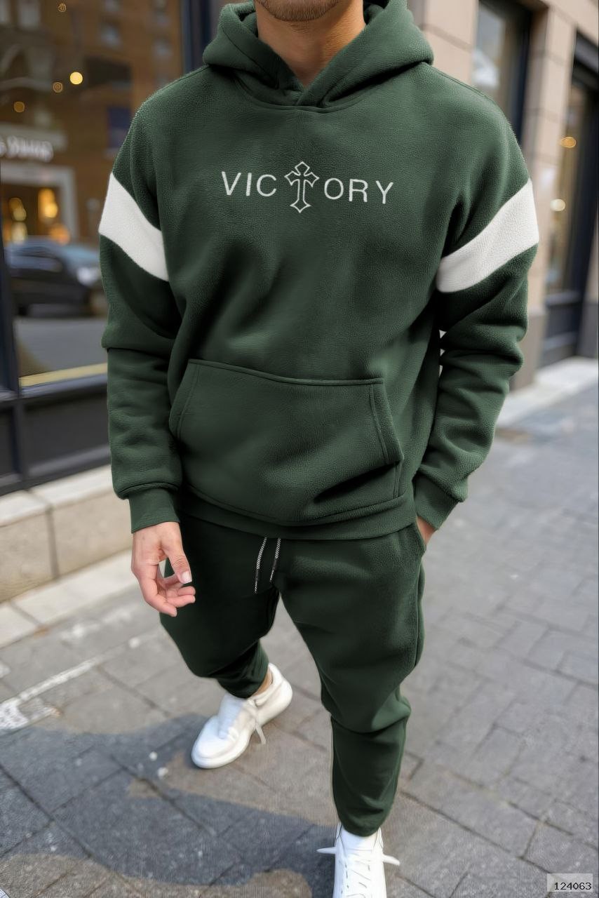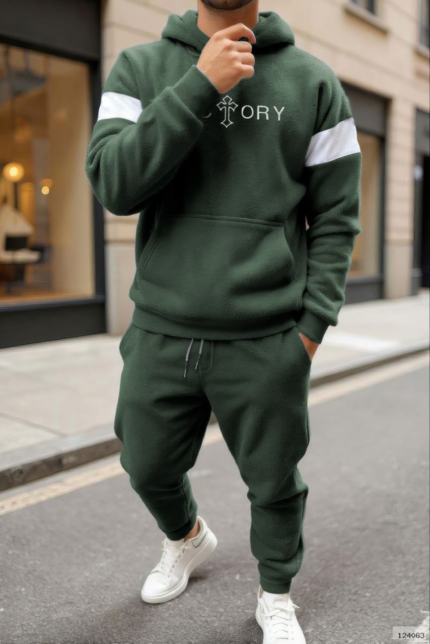 Худі з капюшоном і кишенею-кенгуру,з вишивкою на грудях.Штани з еластичним поясом,бічними кишенями та манжетами на резинці внизу.