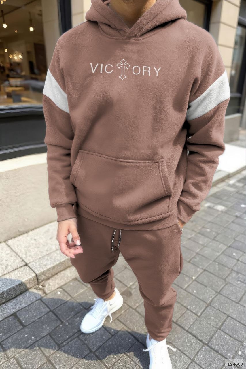 Худі з капюшоном і кишенею-кенгуру,з вишивкою на грудях.Штани з еластичним поясом,бічними кишенями та манжетами на резинці внизу.