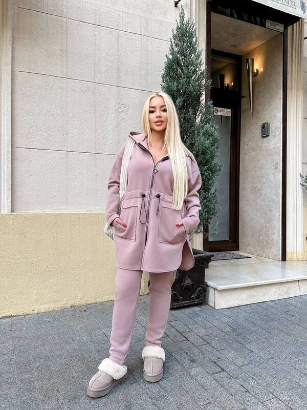 Практичний костюм двійка - ідеальний вибір для зручних та стильних образів.Асиметричний кардиган із капюшоном і куліскою по центру додають оригінальності костюму.