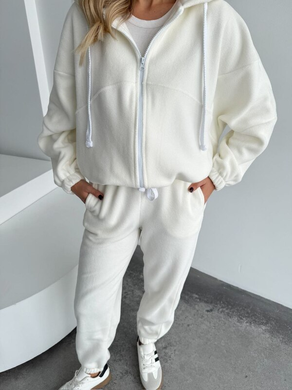 Теплий костюм в деталях, зі штанами джогерами і кофтою на зіпці та понизу на кулісках, подвійним капюшоном. Костюм високої якості і пошитя, стане незамінним в твоєму гардеробі.