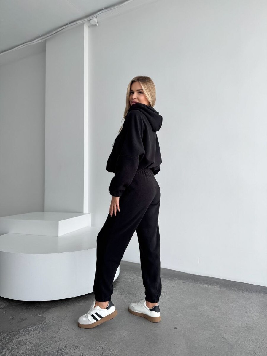 Теплий костюм в деталях, зі штанами джогерами і кофтою на зіпці та понизу на кулісках, подвійним капюшоном. Костюм високої якості і пошитя, стане незамінним в твоєму гардеробі.