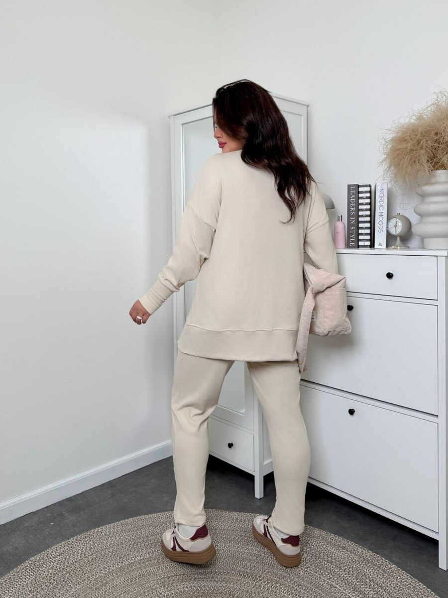 Тканина еластична, має гарну розтяжність. Костюм декорований нашивками, кофта вільна, ззаду подовжена.