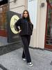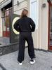 Штані - прямі, із високою посадкою, з кішенями у бічних швах, по низу також утяжка