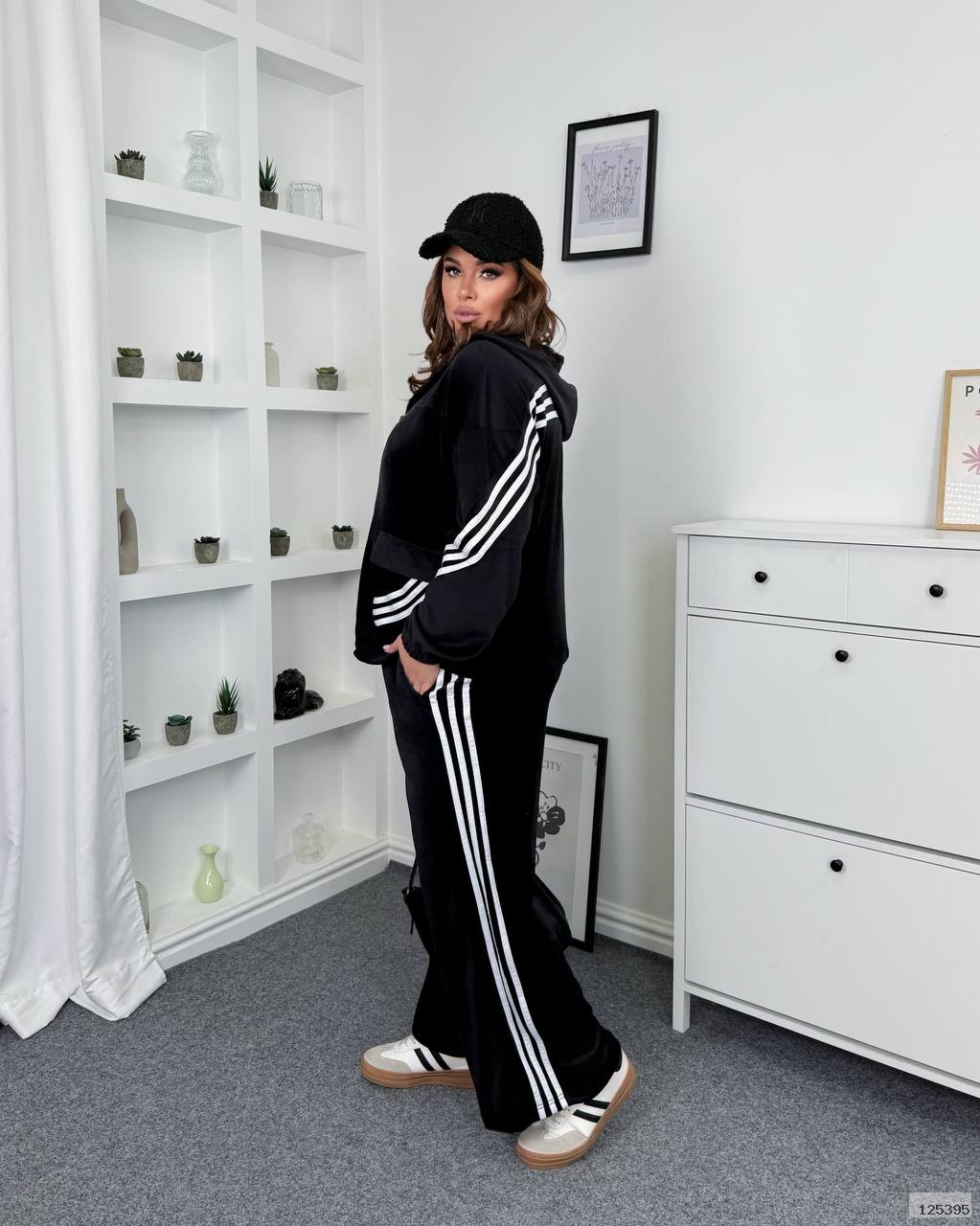 Дуже теплий і приємний на дотик велюровий костюм. Лампаси ідеально доповнюють костюм і роблять його цікавим і стильним. Кофта на молнії, спереду дві кишені, низ затягується на шляпну резинку, є капюшон. Штани на резинці з кишенями з боків.