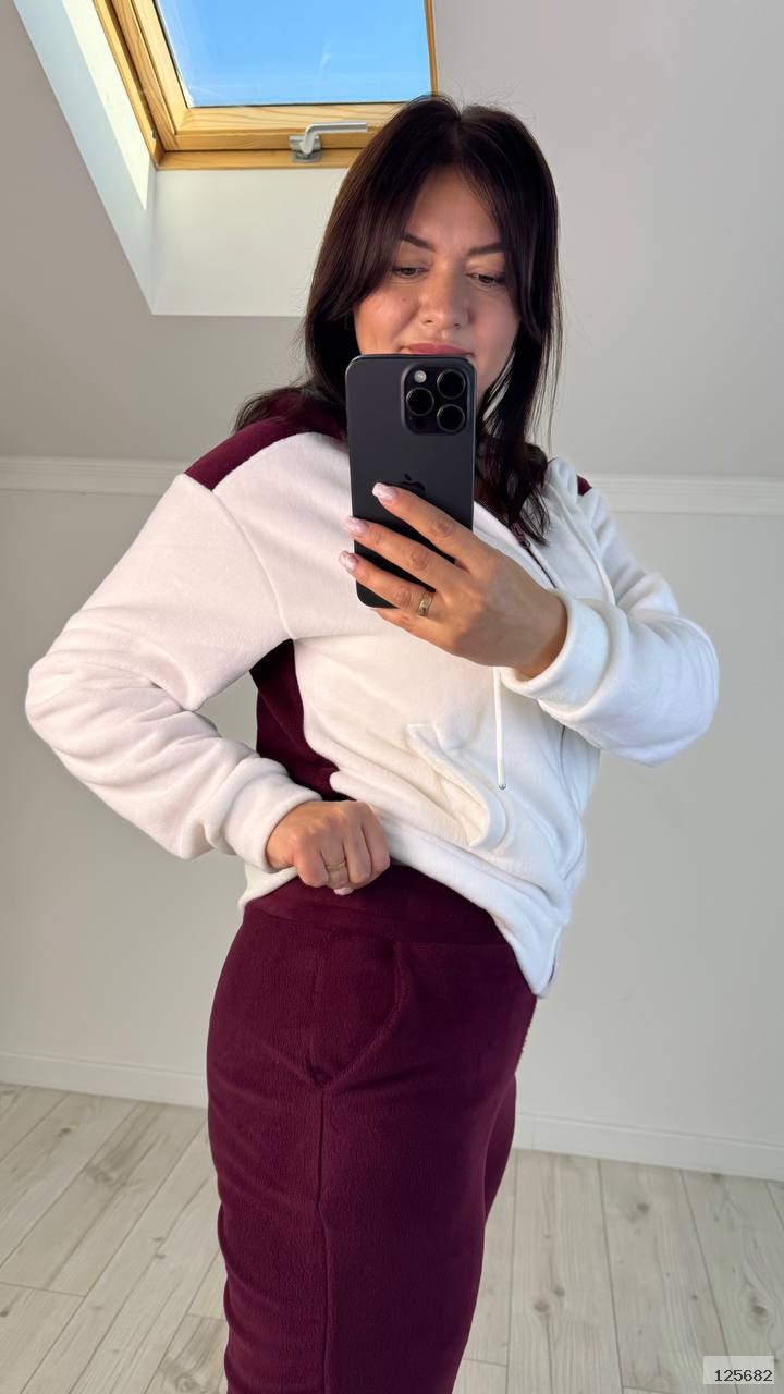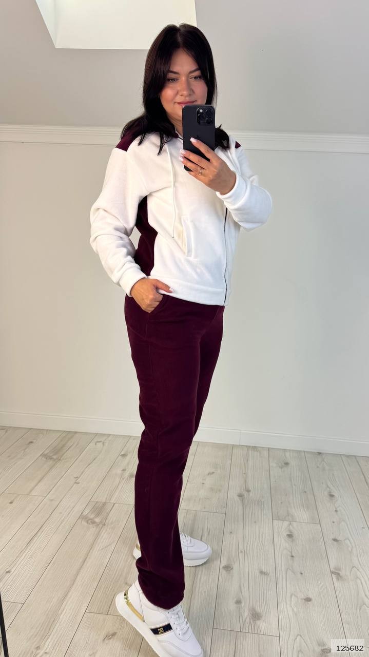 Костюм спортивний штани та кофта. Кофта із капюшоном,на блискавці, рукава на манжетах, з двома карманами. Штани прямого крою до низу, посадка висока, талія на резинці, із кишенями. Дуже теплий, тканина мʼягенька та щільна