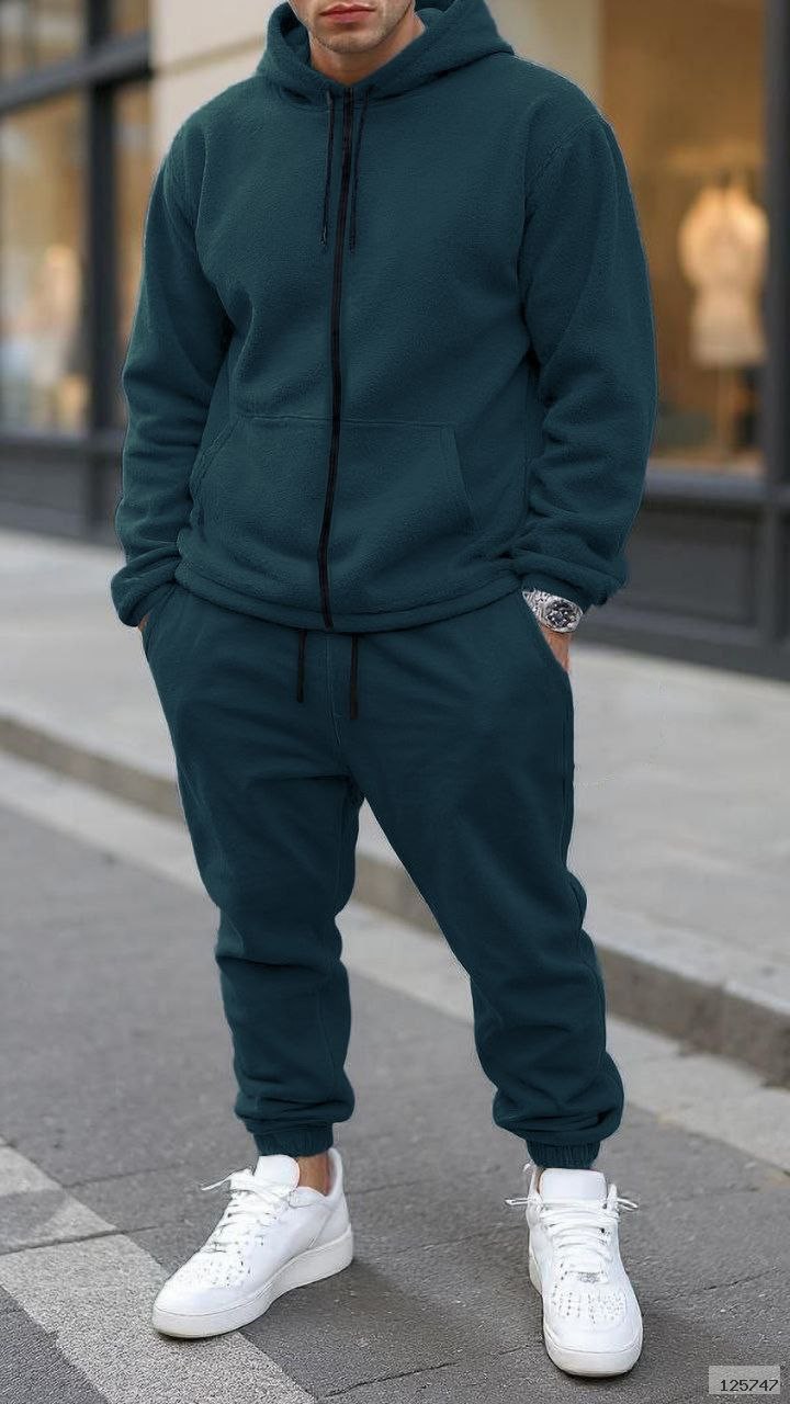 Кофта на блискавці з капюшоном і накладними кишенями.Штани з манжетами на резинці,бічними кишенями та шнурком для регулювання талії.