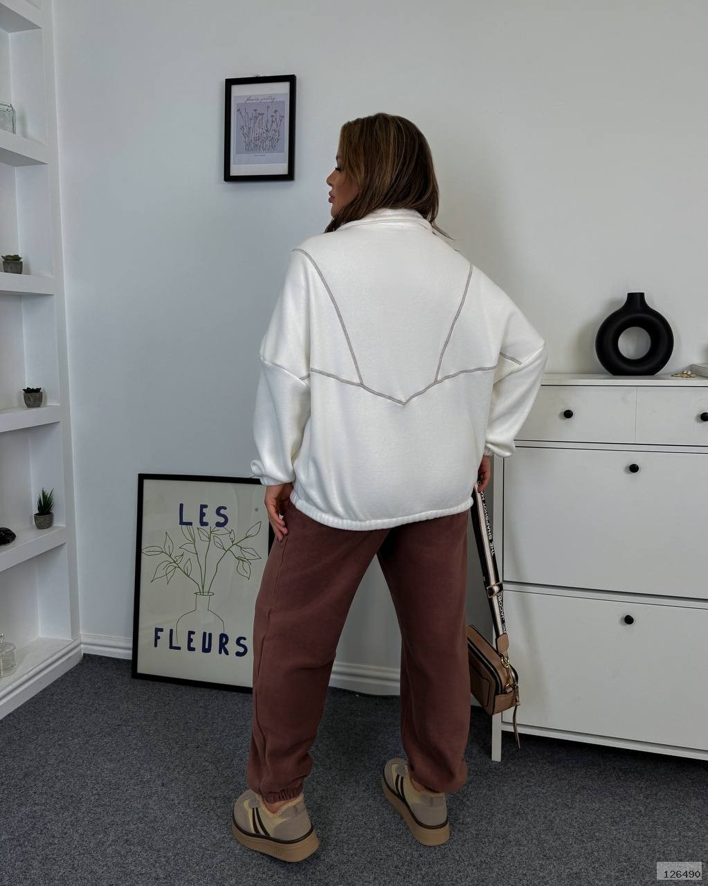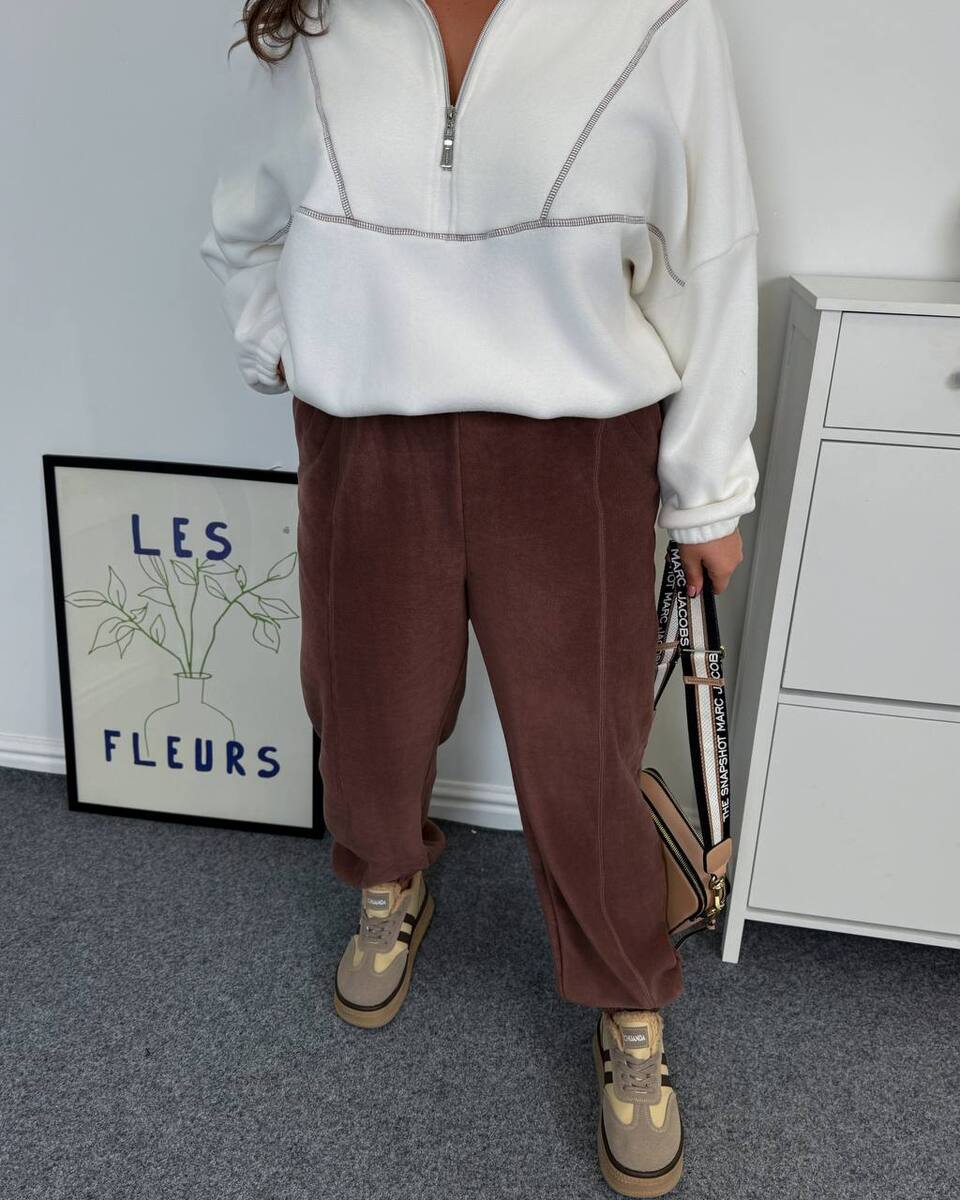Затишний теплий костюм — ідеальний варіант для прохолодної погоди, прогулянок, дому чи подорожей. М’яка тканина приємна до тіла, добре зігріває та забезпечує максимальний комфорт. Светр має вільний оверсайз крій і зручну блискавку, що дозволяє регулювати виріз. Брюки — м’які, комфортні, на резинці, прекрасно сідають і не сковують рухів.
