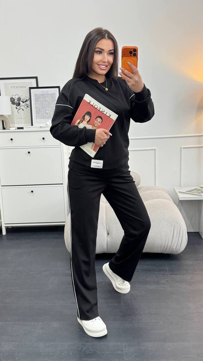 Тканина має гарну розтяжність, не скочується, не втрачає колір при пранні. Костюм декорований нашивкою та кантом. Штани мають високу посадку, пояс на резинці
