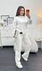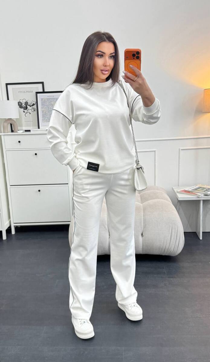Тканина має гарну розтяжність, не скочується, не втрачає колір при пранні. Костюм декорований нашивкою та кантом. Штани мають високу посадку, пояс на резинці