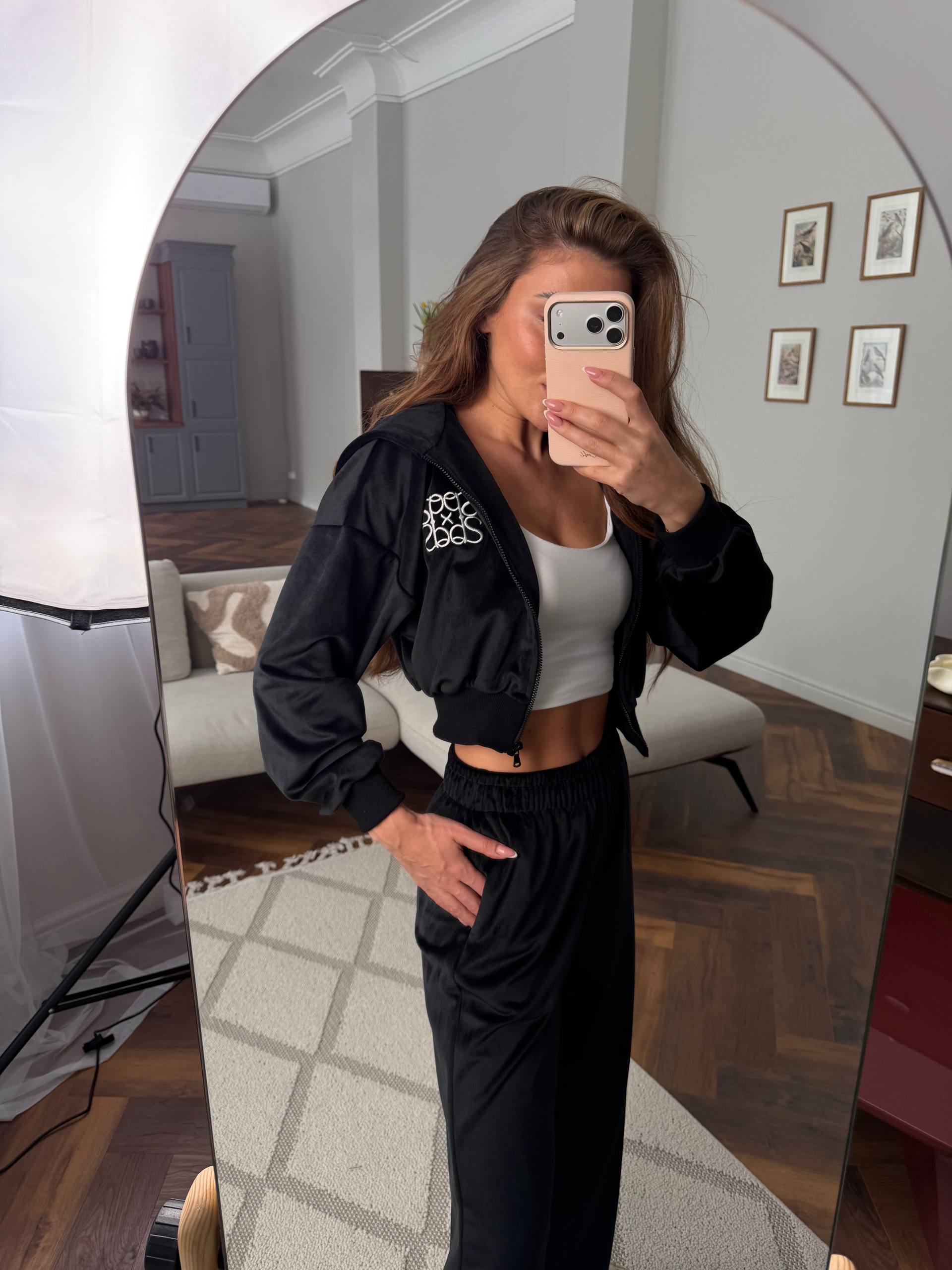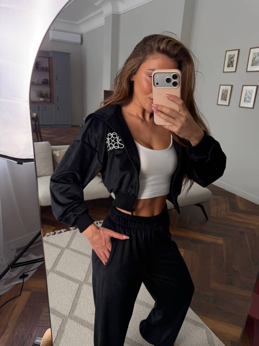 Кофта на блискавці з акуратною вишивкою додає образу преміальності, а вільні штани забезпечують максимальну зручність.