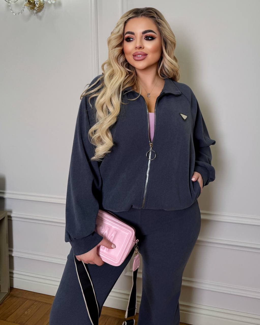 Кофта на змійці з кішенями, по низу фіксатор з утяжкою + штани прямі до низу розширені , з посадкою вище середнього. На поясі гумка.