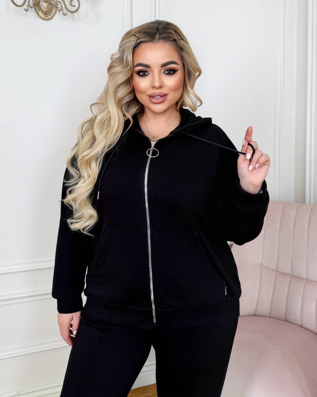 Спортивний костюм на змійці із петлі Хб Турція. Кофта на змійці «худі» з підвійним капюшоном. Штани прямі, трохи розширені донизу, з кишенями у бокових швах, з високою посадкою на талії, пояс на гумці.