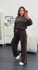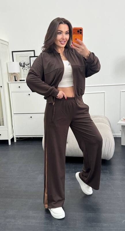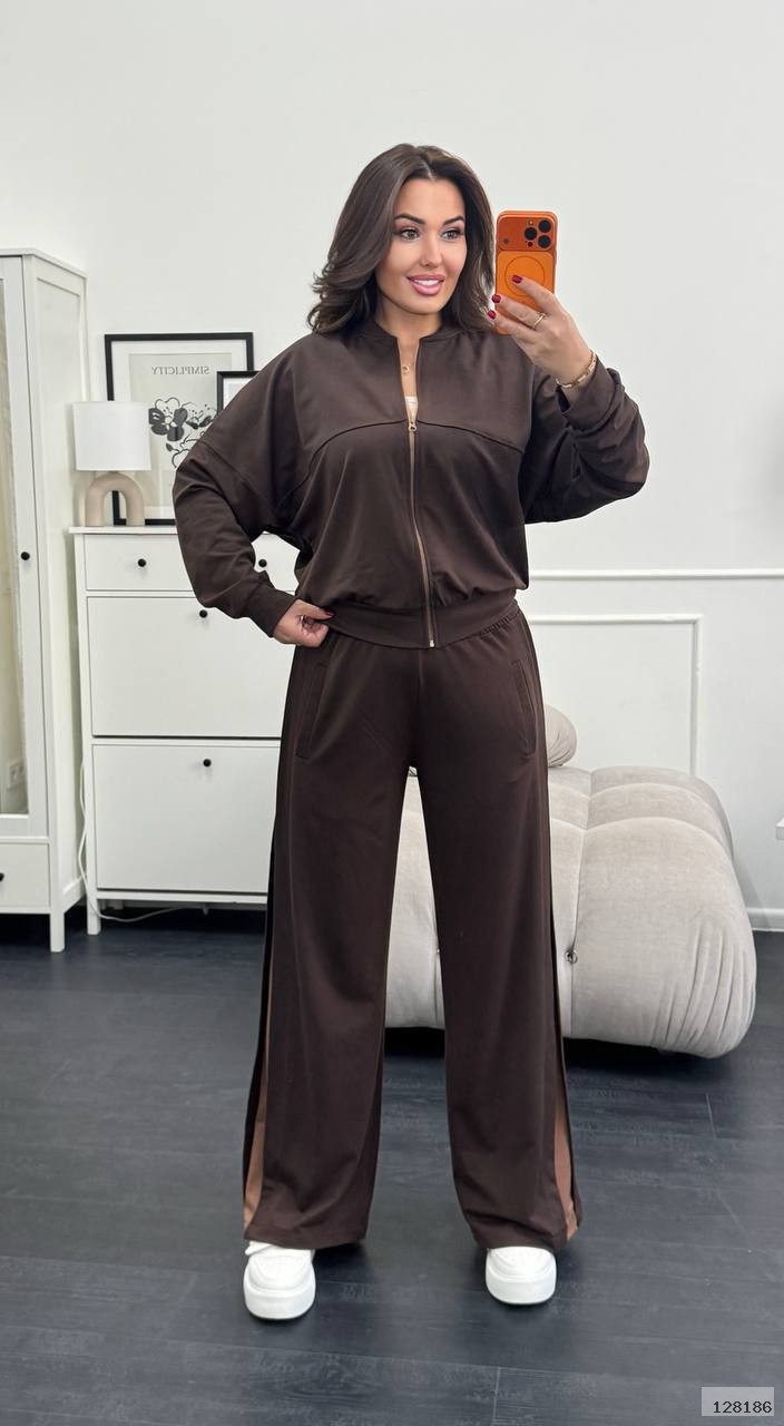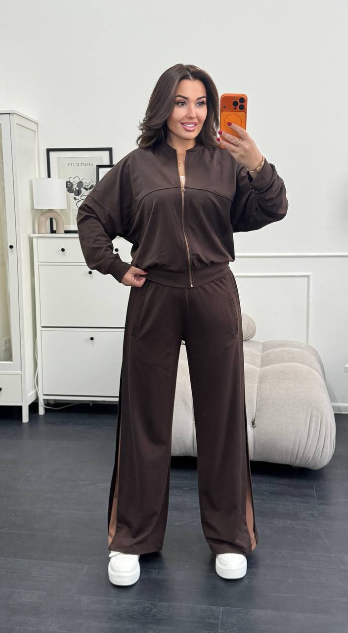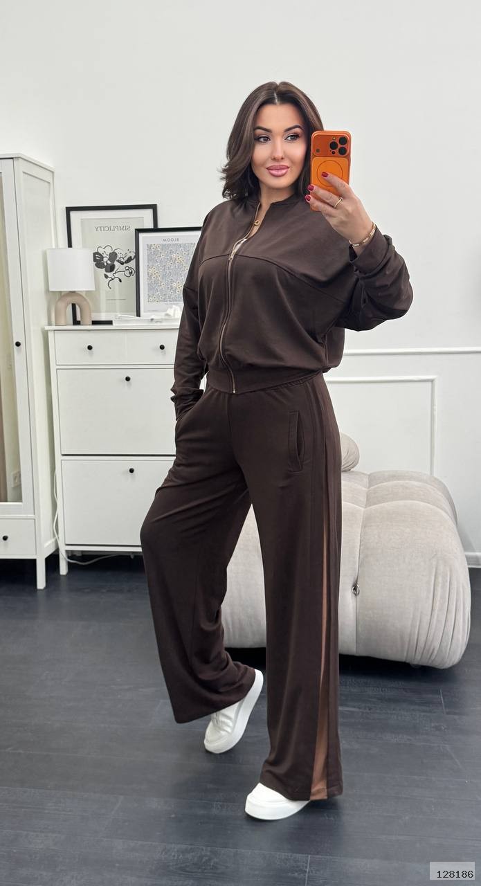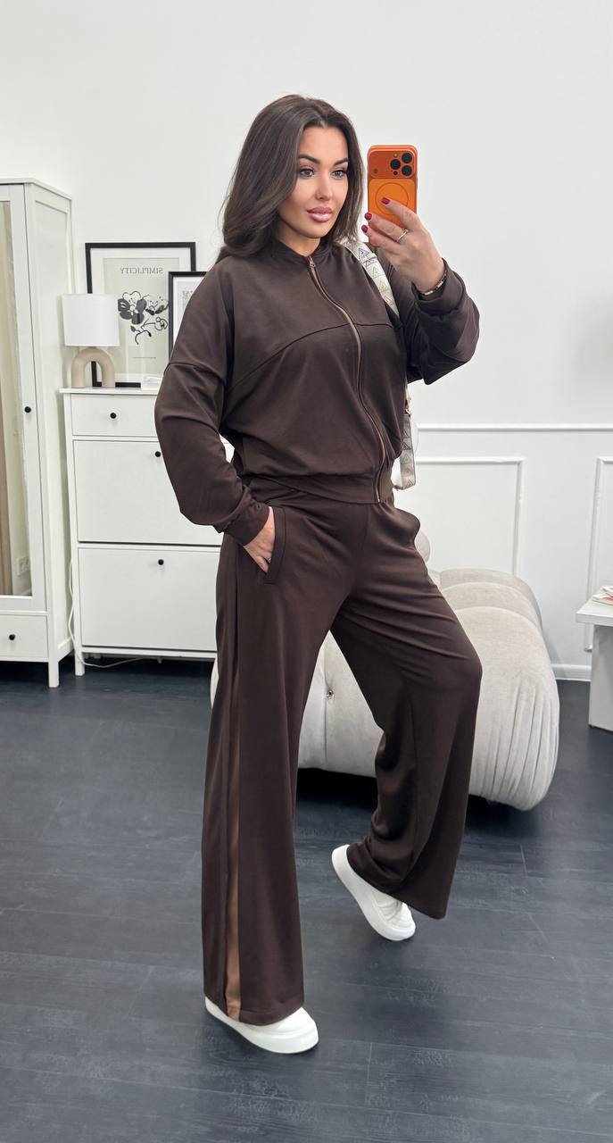 Ідеальне поєднання комфорту та трендового дизайну! Костюм складається з укороченої кофти на блискавці та широких штанів із контрастними лампасами, які візуально подовжують силует.