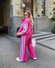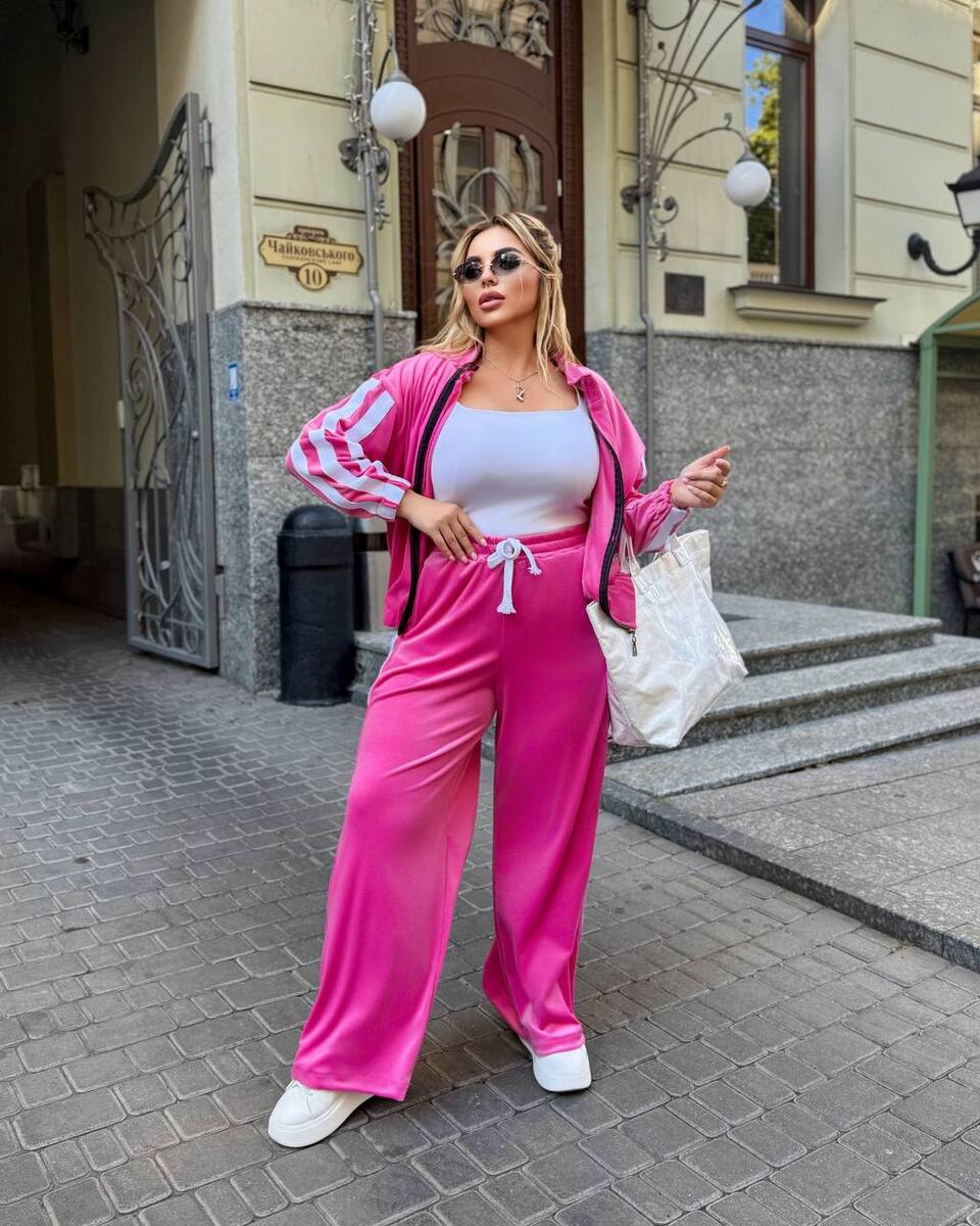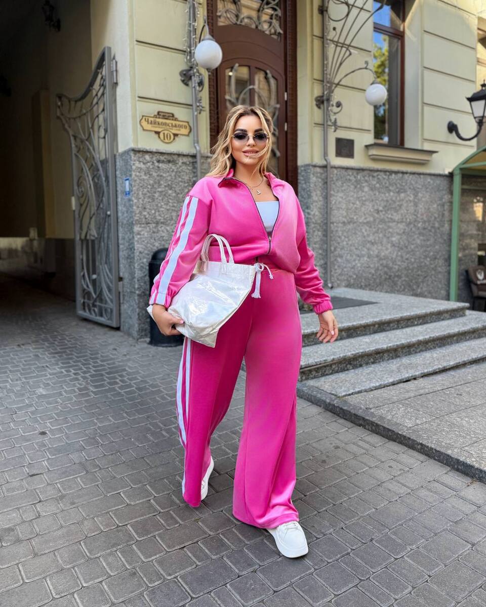 Кофта на блискавці, штанці палаццо висока посадка, пояс на резинці з робочим шнурком в поясі. Лампаси м,які х/б, тканину не стягують, дуже зручний, практичний костюм.