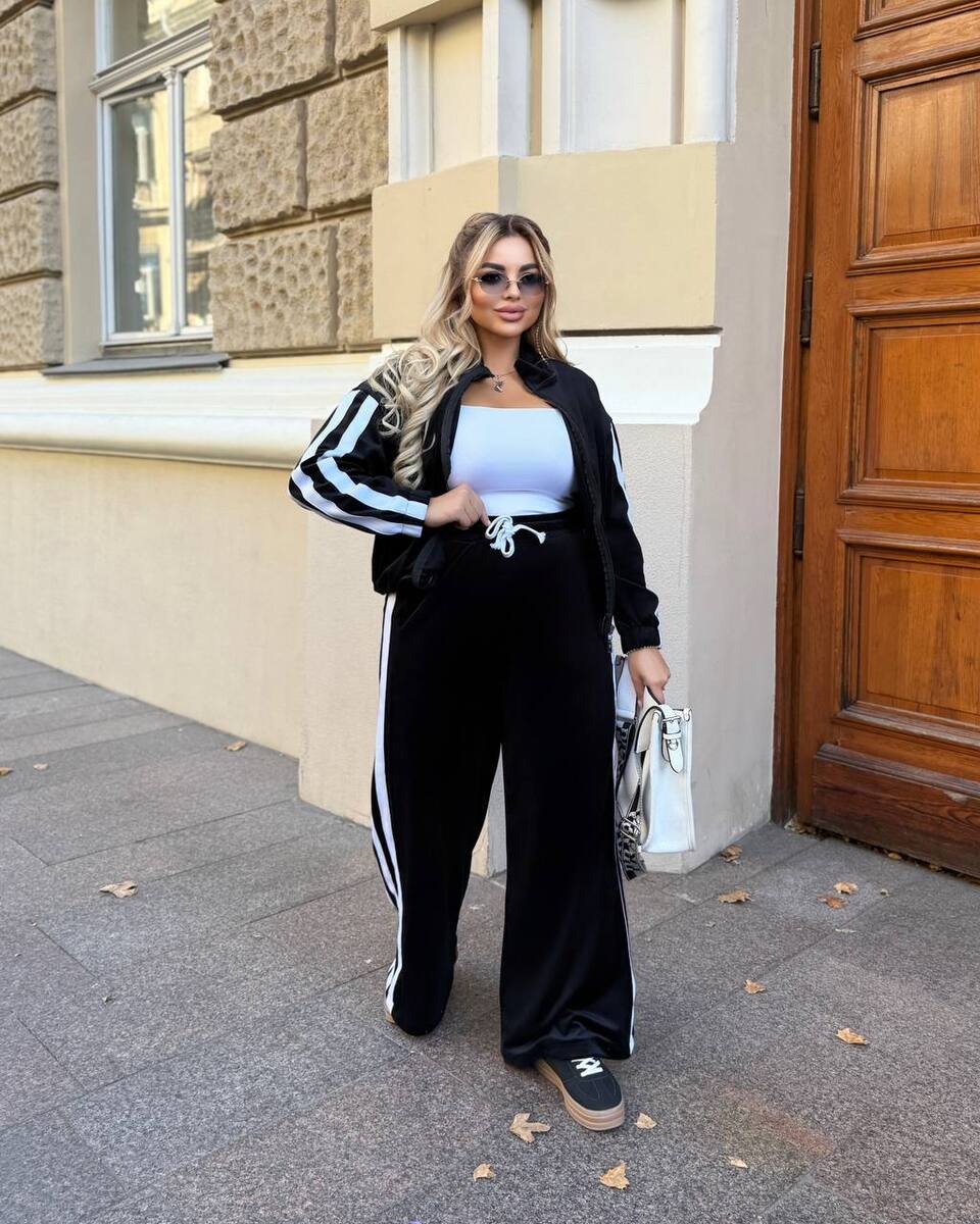 Кофта на блискавці, штанці палаццо висока посадка, пояс на резинці з робочим шнурком в поясі. Лампаси м,які х/б, тканину не стягують, дуже зручний, практичний костюм.