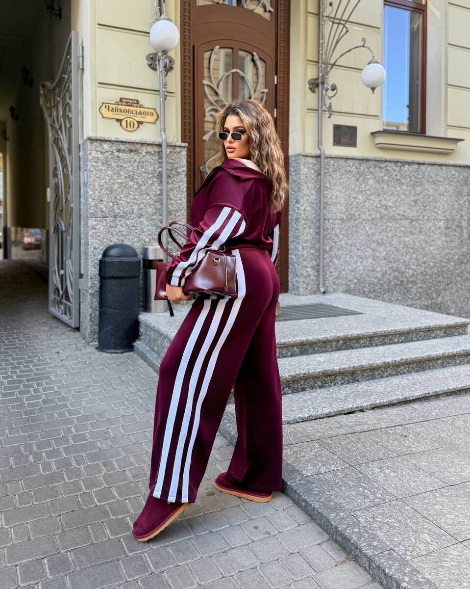 Кофта на блискавці, штанці палаццо висока посадка, пояс на резинці з робочим шнурком в поясі. Лампаси м,які х/б, тканину не стягують, дуже зручний, практичний костюм.