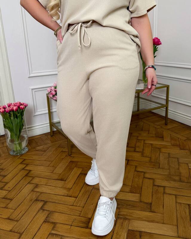 стильний та комфортний костюм з трикотажу еластан: футболка поло у стилі оверсайз з Акс + штани з високою посадкою на еластичній гумці, з кишенями в бічних швах, низ штанів на гумці.