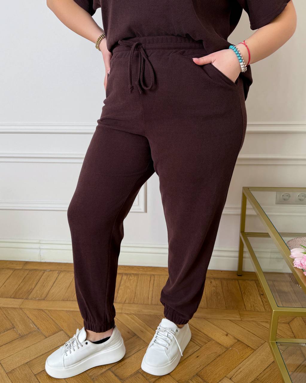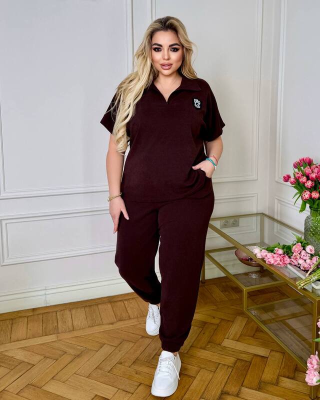 стильний та комфортний костюм з трикотажу еластан: футболка поло у стилі оверсайз з Акс + штани з високою посадкою на еластичній гумці, з кишенями в бічних швах, низ штанів на гумці.