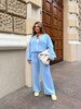 Стильний костюм з просторими штанами на резинці зі шнурком і кишенями та укороченою кофтою зі спущеним плечем і резинкою по низу.