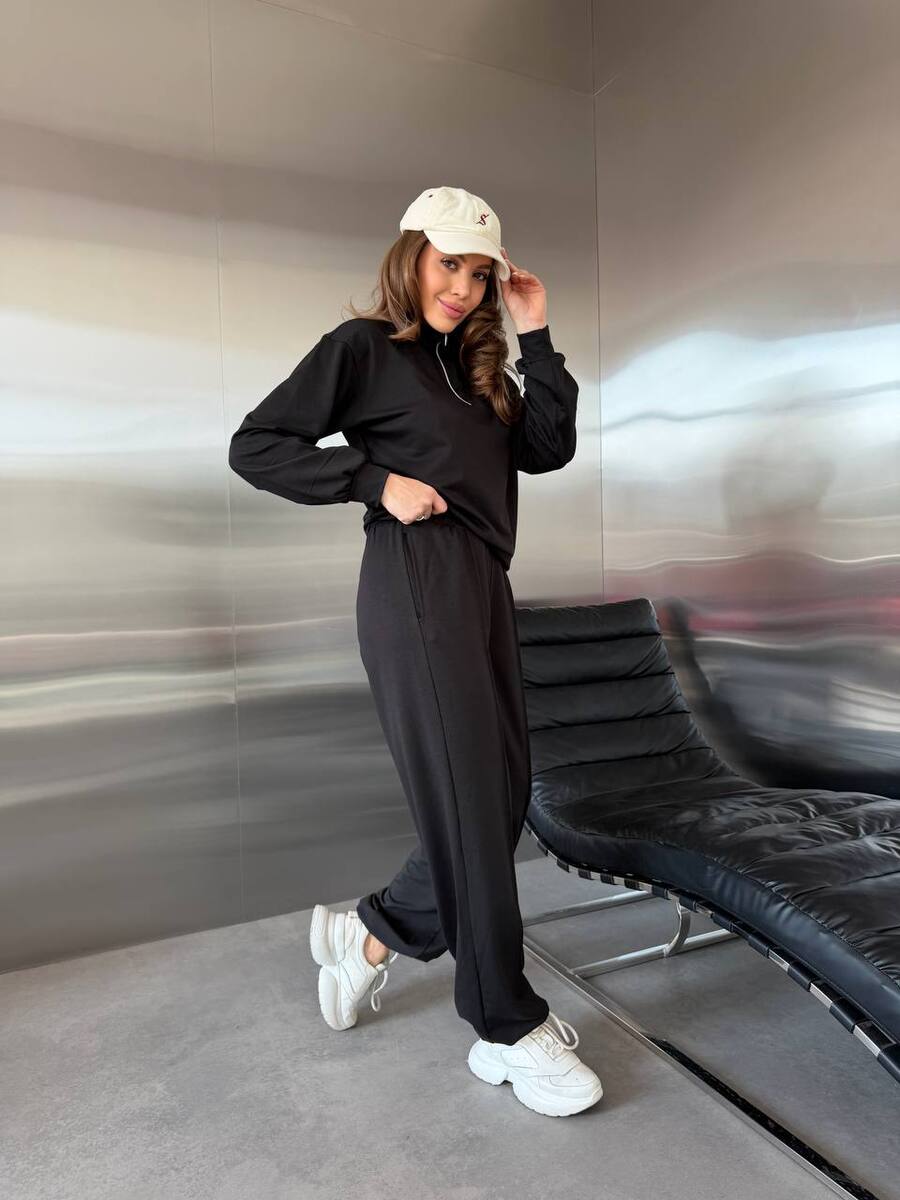 Стильний та комфортний костюм — ідеальний вибір для щоденних образів. Комплект складається зі світшота з високим коміром на блискавці та вільних штанів із м’якою посадкою. Лаконічний дизайн робить модель універсальною — підходить як для прогулянок, так і для подорожей чи домашнього відпочинку.